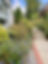 A parklette with a staircase to the street above. Gardens on both sides with trees, shrrubs, many roses and pollinators.