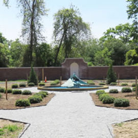 The walled garden, commissioned by Sarah Gardiner and built in the 1930’s is enclosed by a red brick wall constructed by Italian masons. Archival photos show a grid plan used within the walls that showcased roses, a vegetable garden and long peony runs. There is also a garden house, cold frames and statuaries. The highlight of the garden is a peacock fountain sculpted by Mary Aldrich Fraser, whose father Spencer Aldrich was a prominent and active Bay Shore resident. The gardens, long neglected, are currently being restored by the Friends of the Manor Gardens.